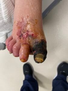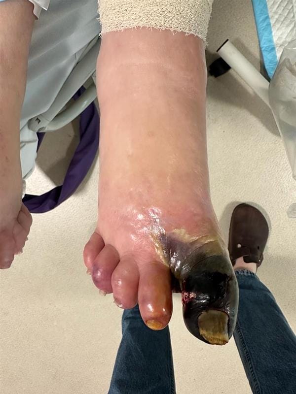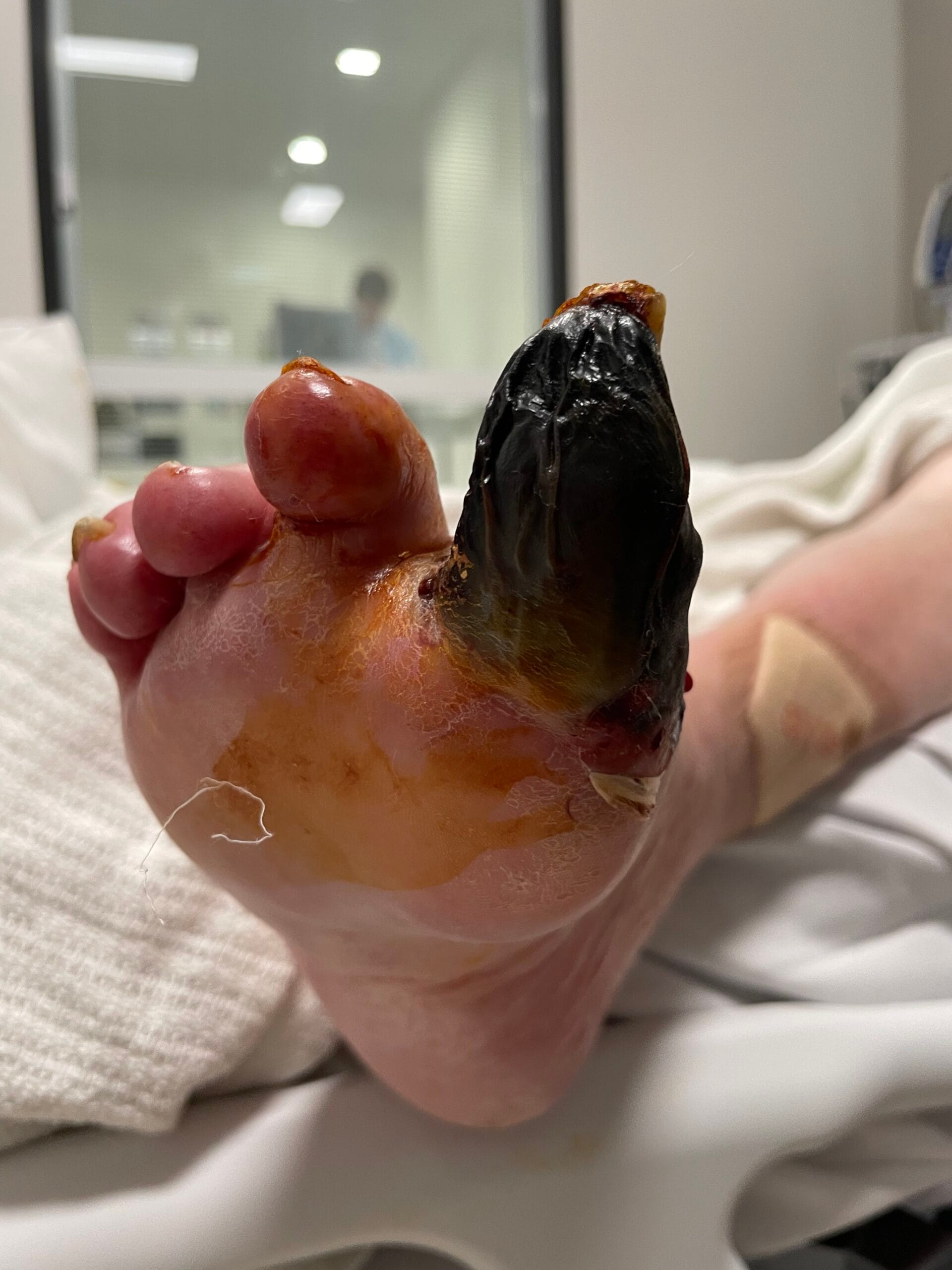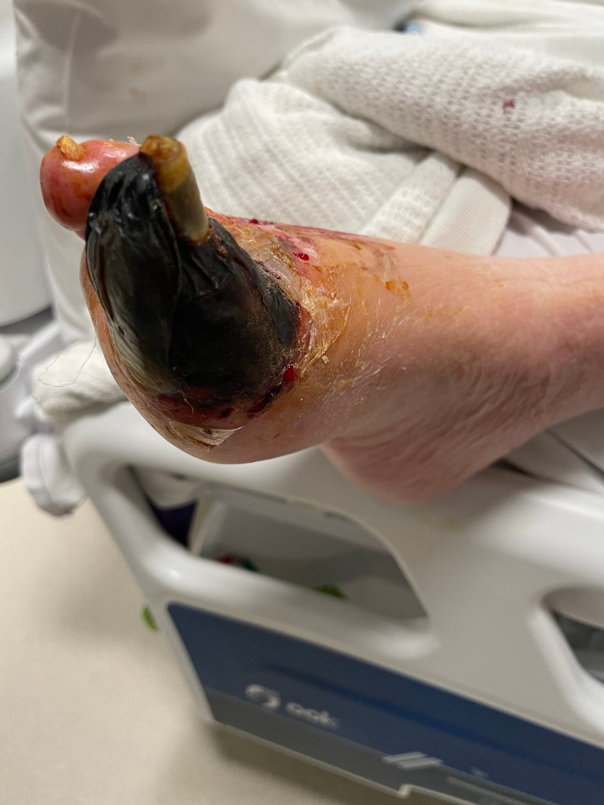 To stop the dry necrotic tissue causing an infection that could lead to sepsis. By drying out the toe and waiting for demarcation to occur it will allow the surgeon to know where the healthy tissue is and where to amputate which will aid in the healing process and stop repeated debridement.