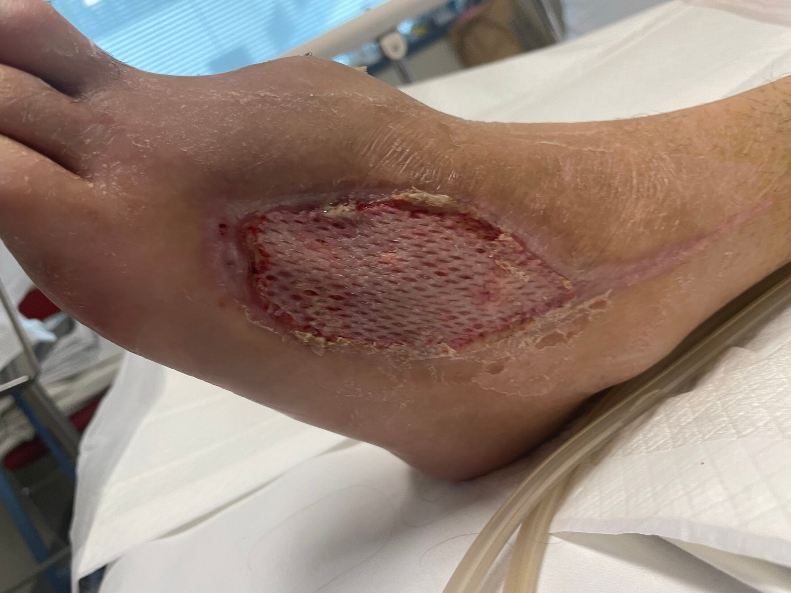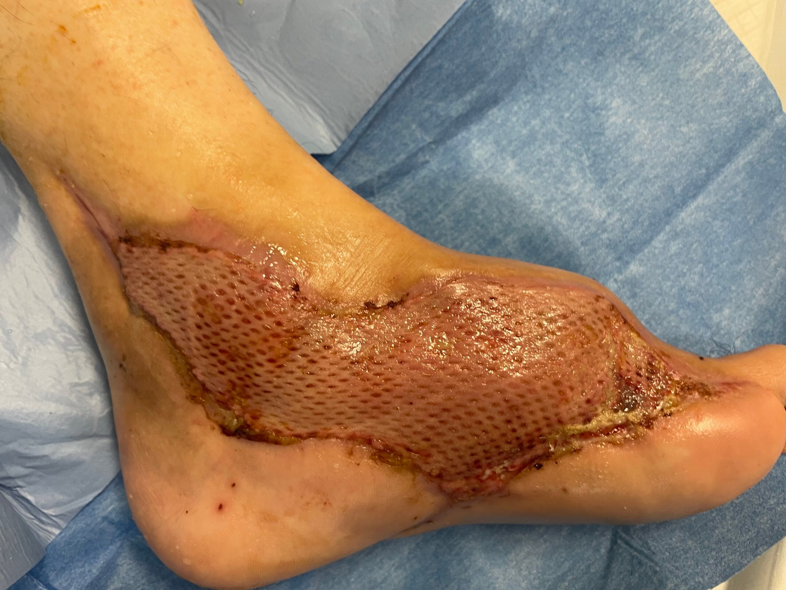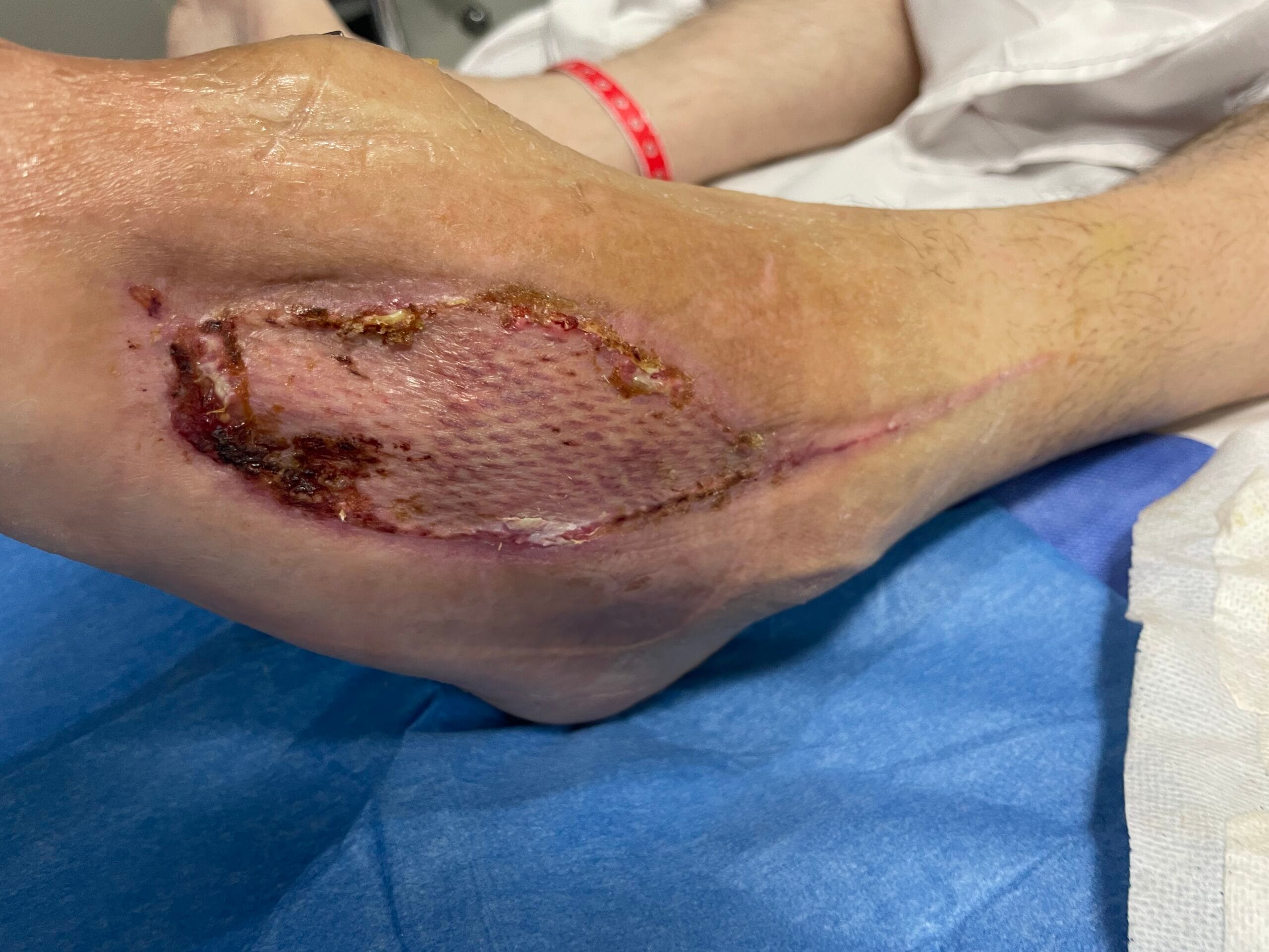 The split skin graft is not macerate and is not dry. Minimal management is needed. The dressing plays the roll of minimising sheering and blunt for trauma