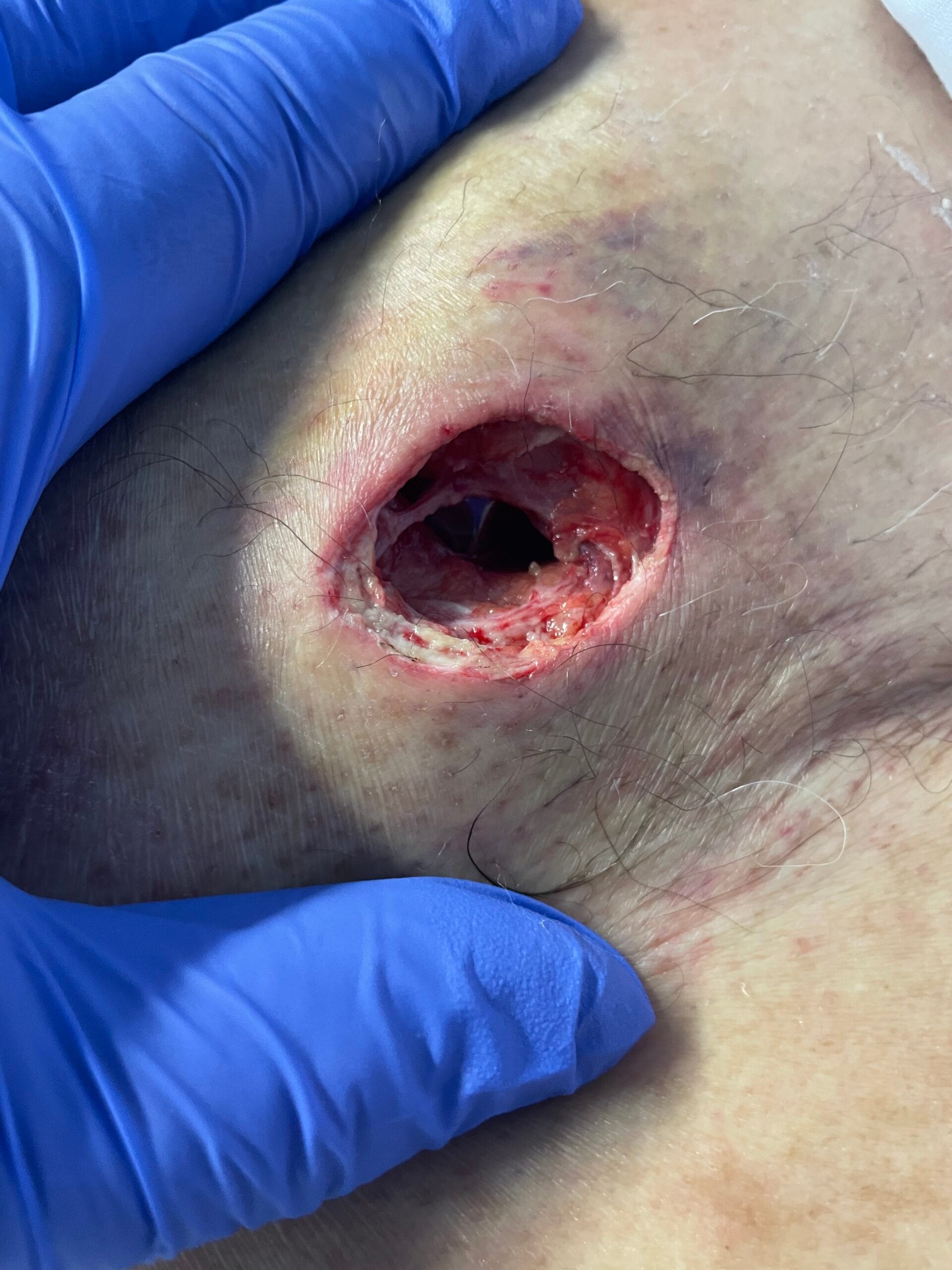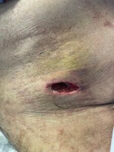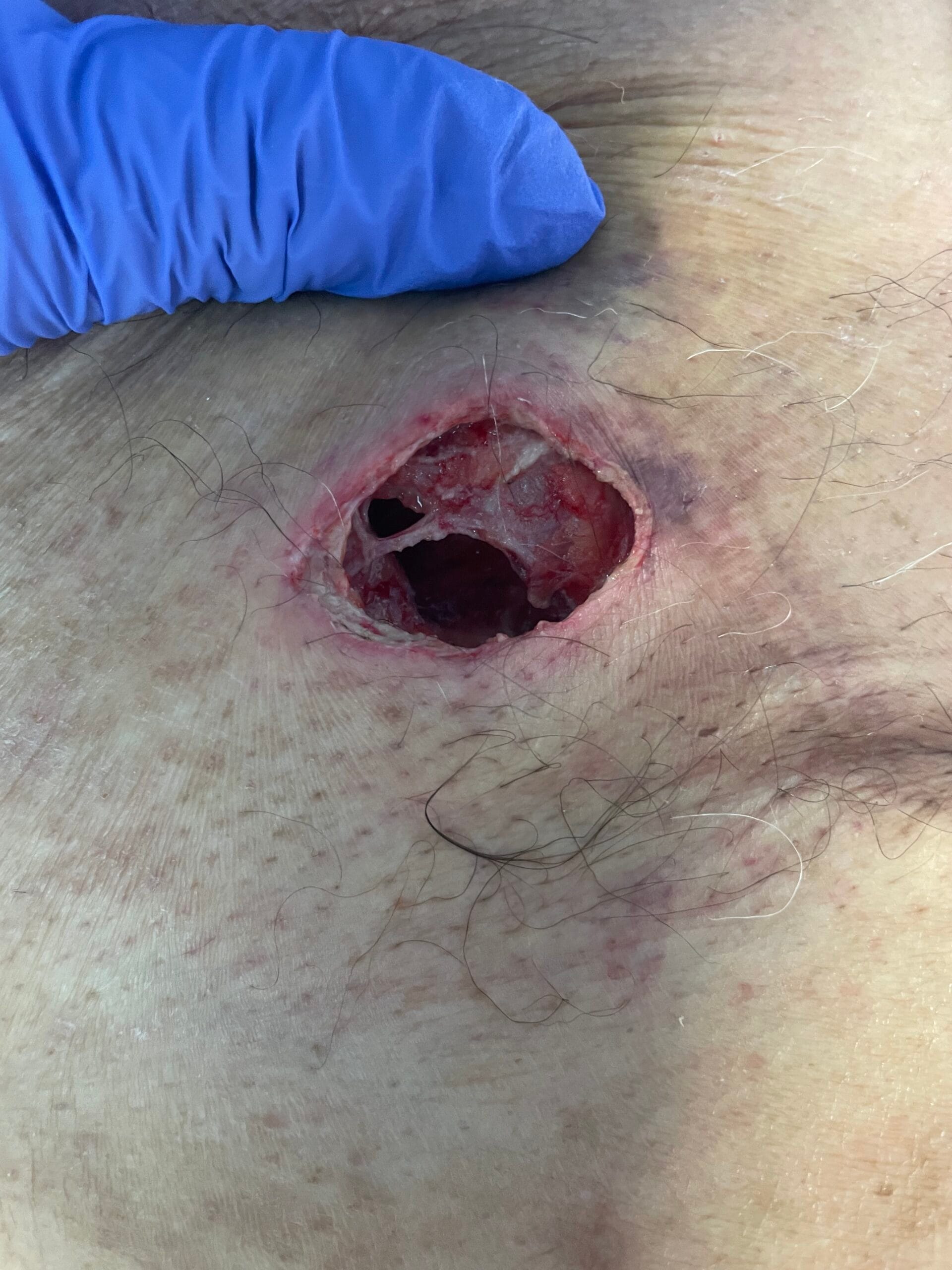 Patient had an infected right femoral graft 3 years after its insertion. A seroma had formed and and incision and drainage was completed.