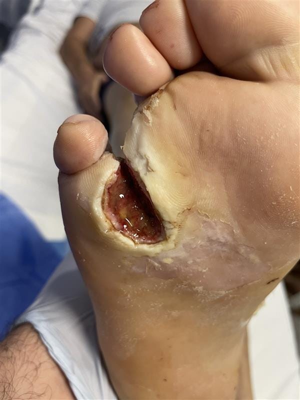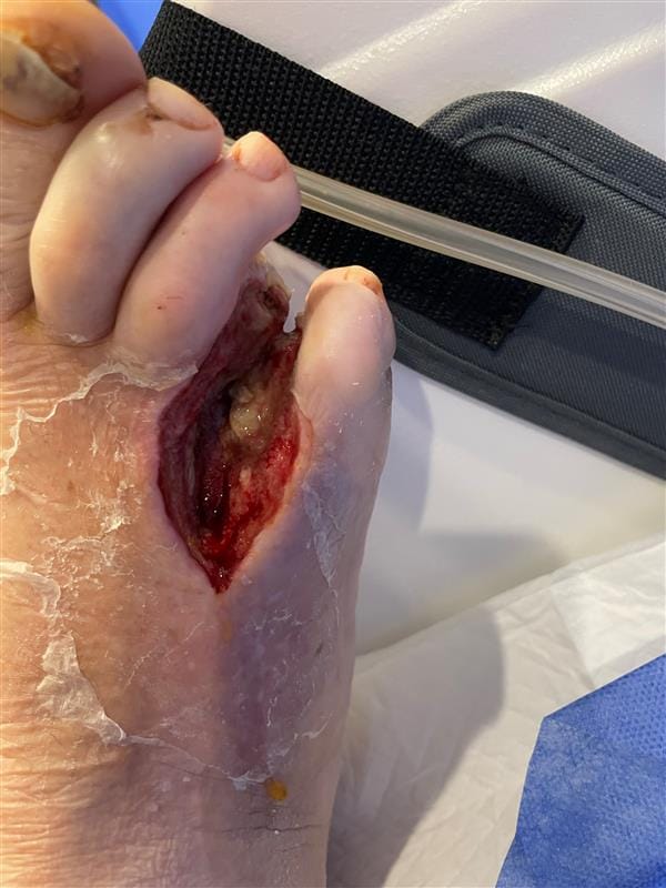 Aid in the granulation of the wound bed whilst providing a water resistant dressing that is tracked to allow for footwear to be worn without risk of a pressure injury occuring