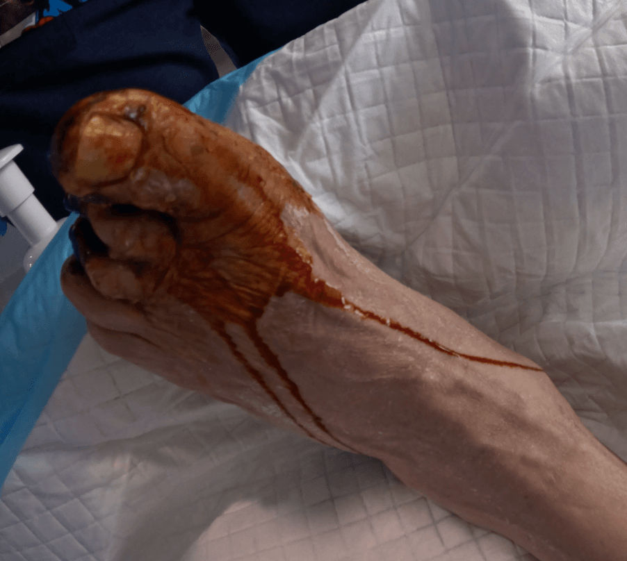 If avoidable please don’t wrap up the affected limb as the moisture and sweat can make the ischemic area turn into wet gangrene. It was done at the patient’s insistence.