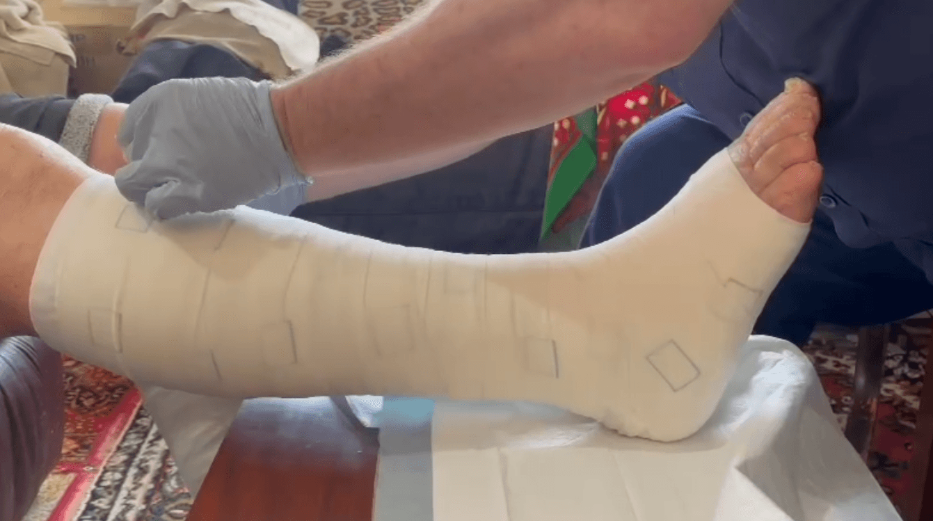 3.Start the cotton bandage and compression bandage below the 5th toe with minimal to no tension