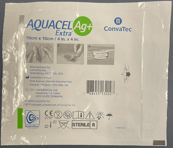 DRESSING, WOUND, ANTIMICROBIAL, ABSORBENT, NON-ADHESIVE, ANTISEPTIC, SILVER IMPREGNATED, 10X10CM, 2 LAYERS OF HYDROFIBER, EXTRA STRONG, SQUARE, STERILE (AQUACEL AG+ EXTRA)