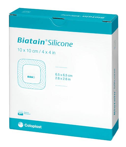 Biatain Silicone Foam Adhesive Dressing 10 x 10cm is a soft and conformable polyurethane foam dressing with a semi-permeable, bacteria and waterproof top film, a lock-away layer and a soft silicone adhesive layer.When in contact with exudate the unique 3D foam structure of Biatain Silicone conforms closely to the wound bed for superior absorption – even under compression