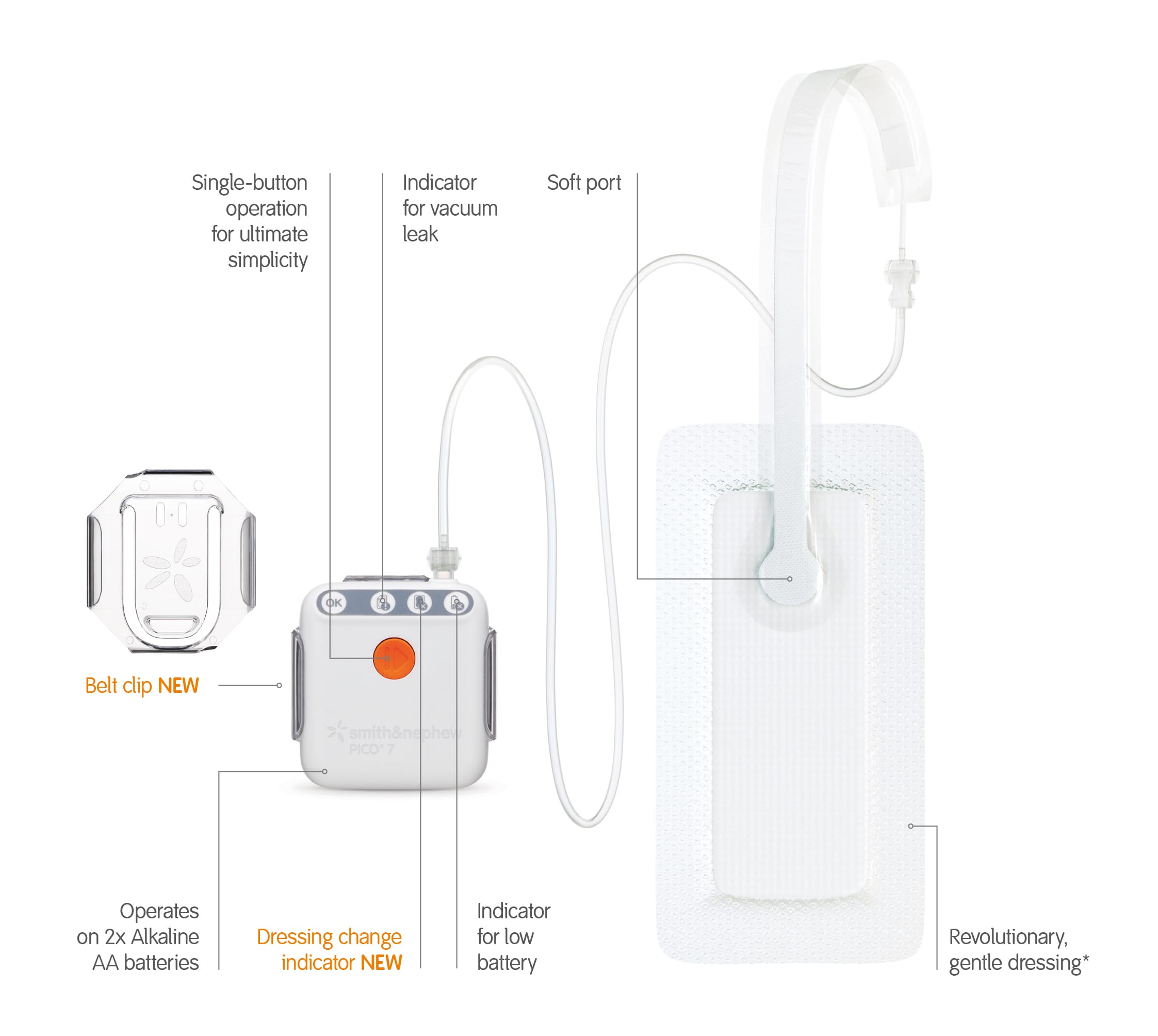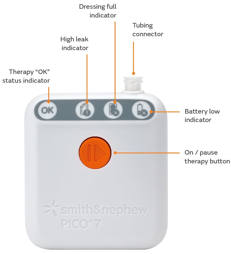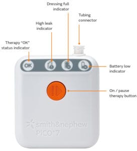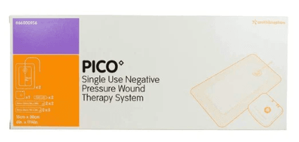 The PICO NPWT is a wound care system, which provides suction known as Negative Pressure Wound Therapy (NPWT). This draws out excess fluid from a wound and provides a compressive force protecting the injured area from getting dirty to ultimately help promote healing. The PICO NPWT system consists of an NPWT pump connected to an absorbent gentle adhesive dressing.