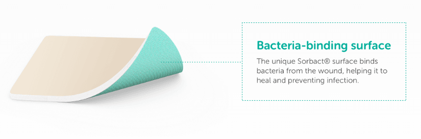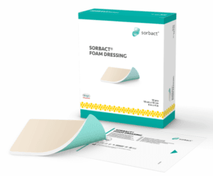 Sorbact® Foam Dressing is a sterile foam dressing that binds bacteria and fungi. It consists of a green Sorbact® wound contact layer combined with a polyurethane foam, with a semi-permeable backing film. Sorbact® Foam Dressing absorbs and retains wound fluid, thereby reducing the risk of maceration, and creates a moist wound environment. The semi-permeable backing film allows excess fluids to evaporate.