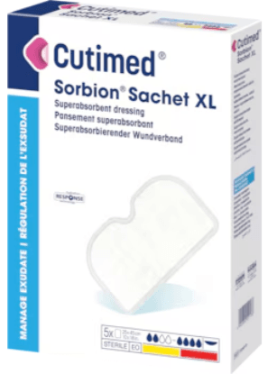 Cutimed® Sorbion® Sachet XL is a sterile, hydroactive, gel-forming, superabsorbent wound dressing. The dressing consists of a superabsorbent core with high retention capacity and an outer layer made from a hypoallergenic polypropylene.